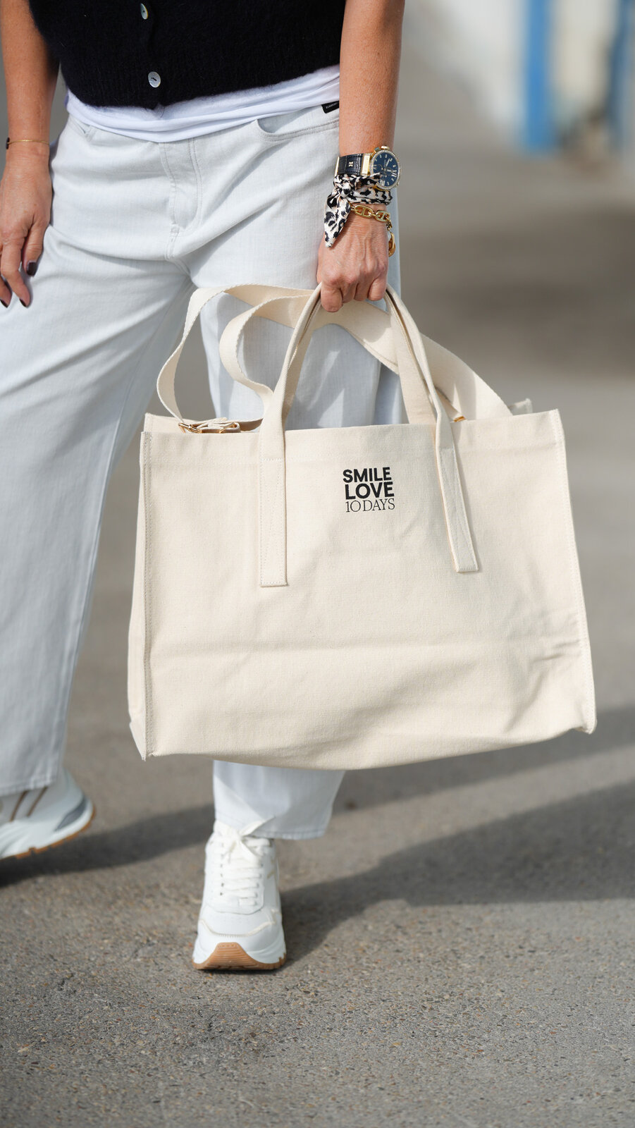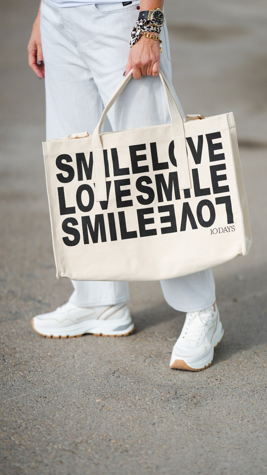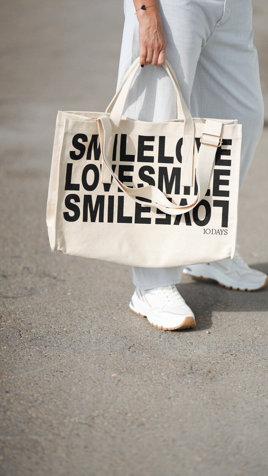 - einem „SMILE LOVE 10DAYS“-Aquarell-Print auf der Vorderseite
