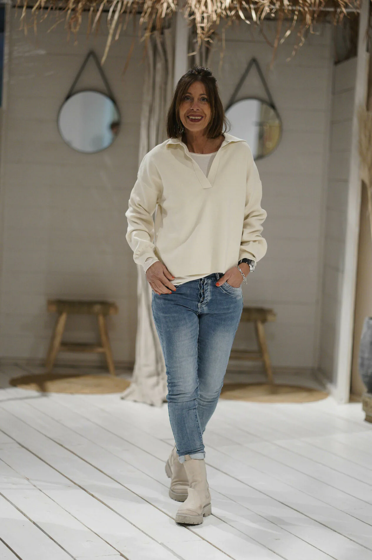 - Saumabschluss ohne Bündchen mit kleinem Lable Patch an der linken Seite