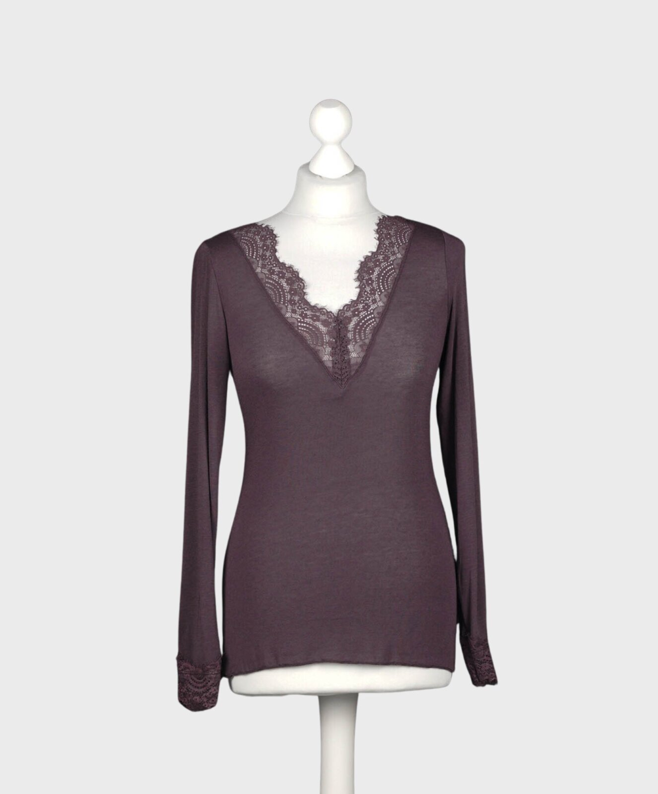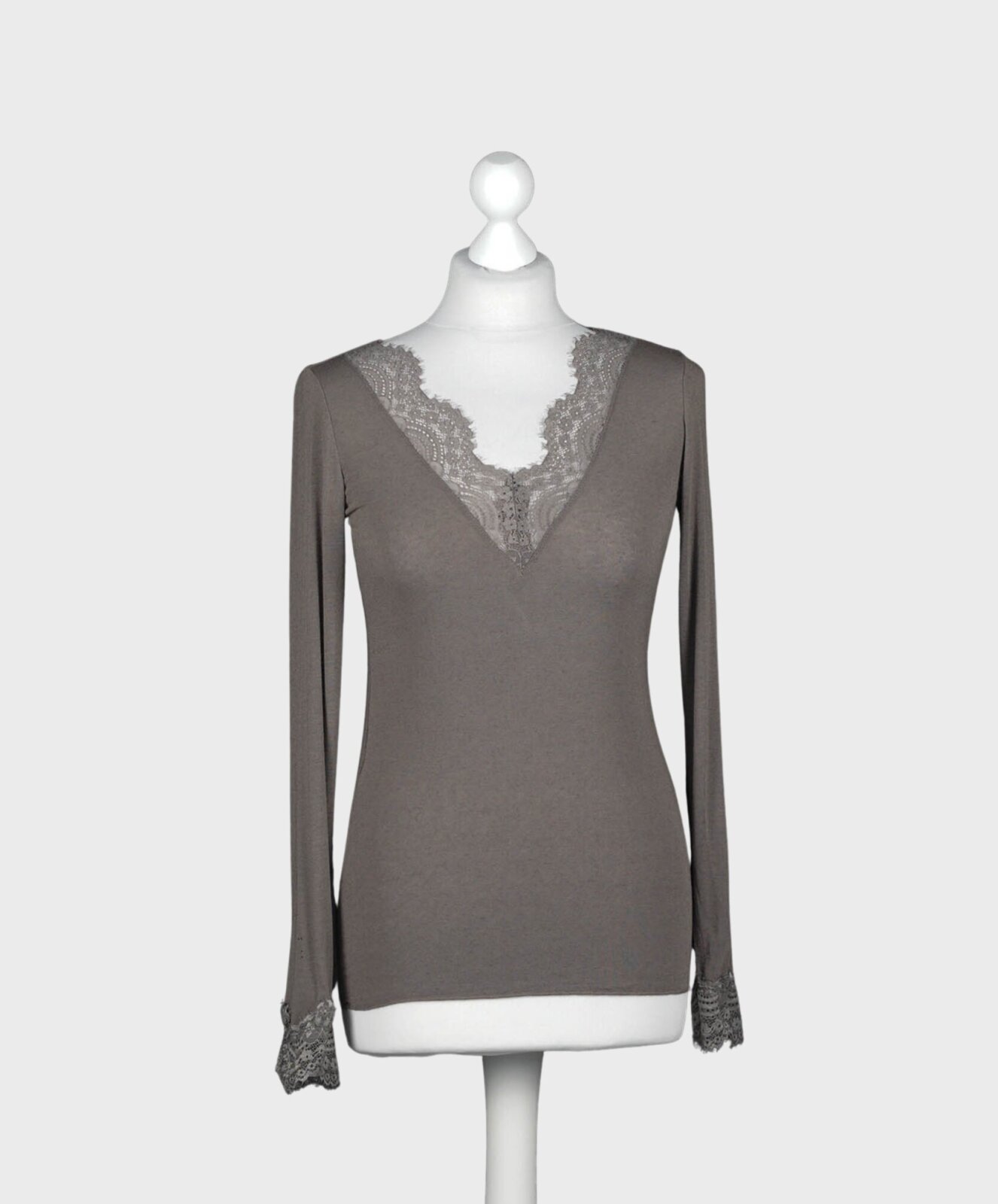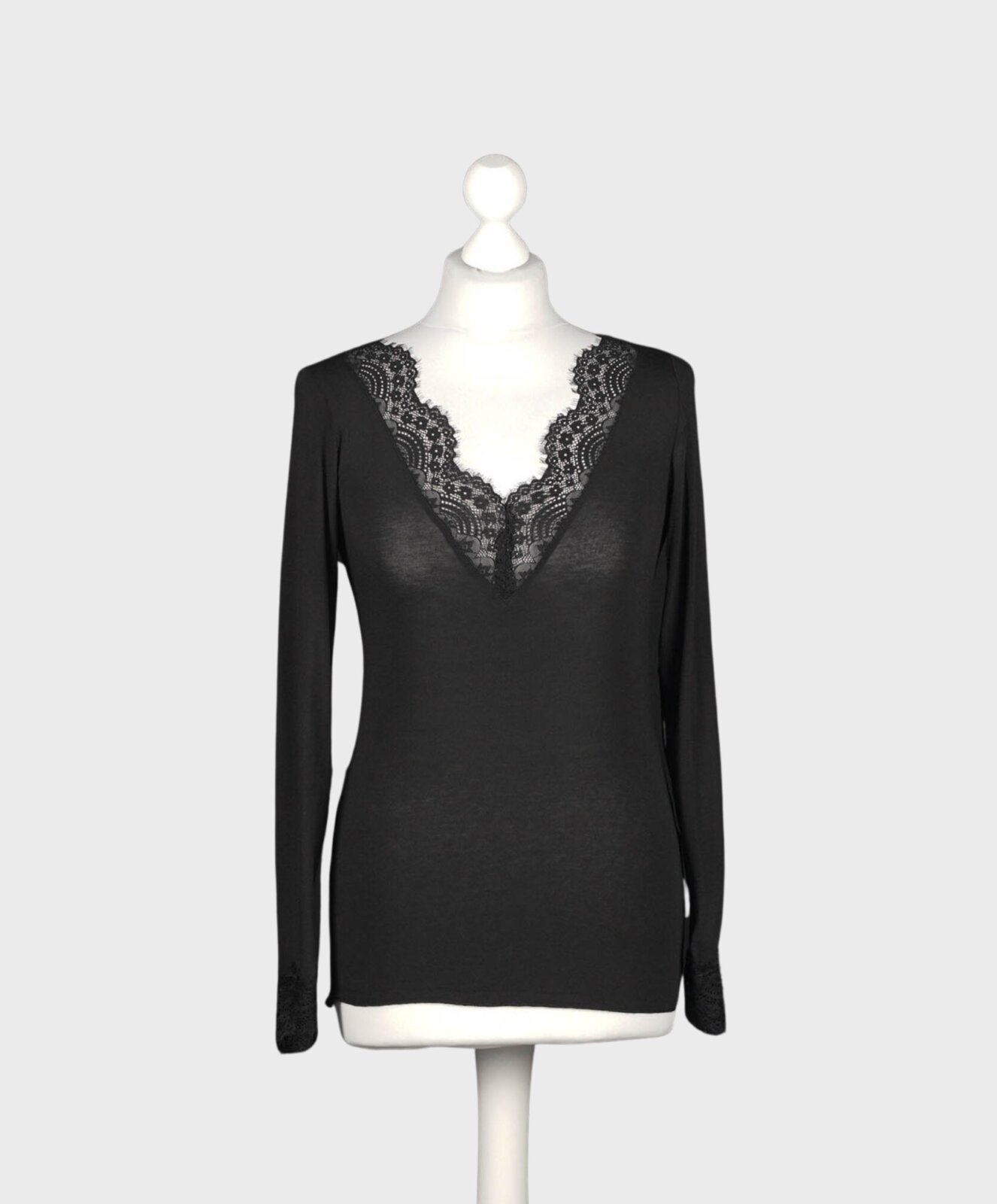 Dieses elegante Langarmshirt verbindet feminine Raffinesse mit angenehmem Tragekomfort. Der V-Ausschnitt mit zarter Spitze setzt ein stilvolles Highlight und verleiht dem Shirt eine sinnliche Note. Durch das leicht transparente Material entsteht ein moderner, edler Look, der sich perfekt für sowohl lässige als auch elegante Outfits eignet. Die figurbetonte Passform schmeichelt der Silhouette, während der Spitzenbesatz am Ärmelende das Design harmonisch abrundet. Dank der soften Haptik fühlt sich das Shirt besonders angenehm auf der Haut an und bietet hohen Tragekomfort über den ganzen Tag.