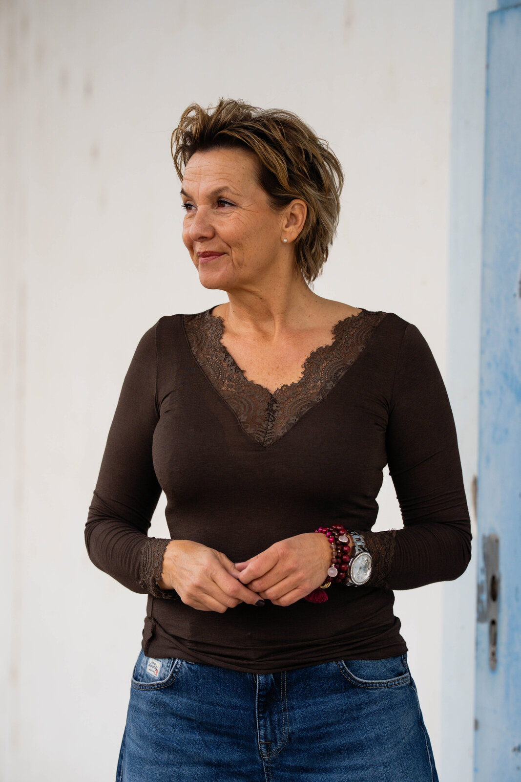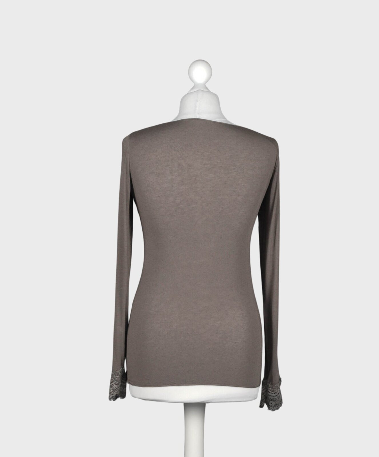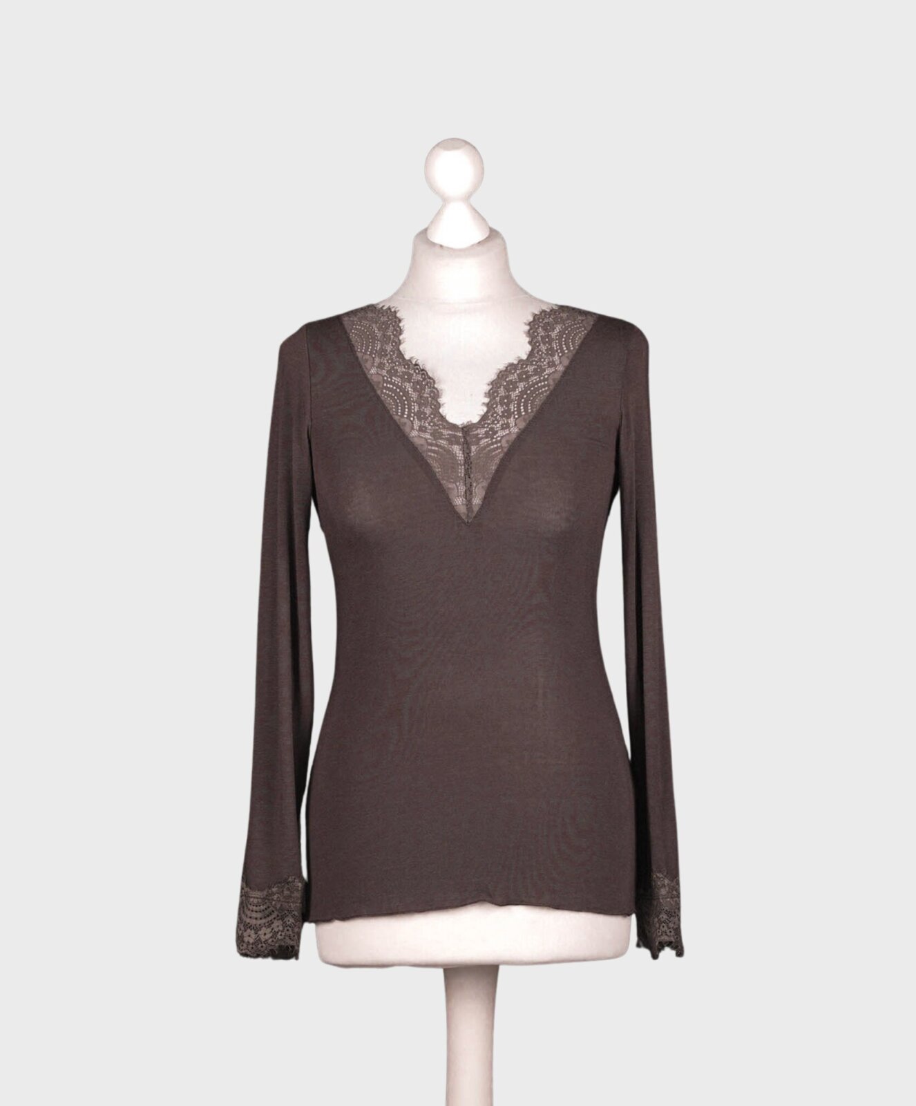 Dieses elegante Langarmshirt verbindet feminine Raffinesse mit angenehmem Tragekomfort. Der V-Ausschnitt mit zarter Spitze setzt ein stilvolles Highlight und verleiht dem Shirt eine sinnliche Note. Durch das leicht transparente Material entsteht ein moderner, edler Look, der sich perfekt für sowohl lässige als auch elegante Outfits eignet. Die figurbetonte Passform schmeichelt der Silhouette, während der Spitzenbesatz am Ärmelende das Design harmonisch abrundet. Dank der soften Haptik fühlt sich das Shirt besonders angenehm auf der Haut an und bietet hohen Tragekomfort über den ganzen Tag.