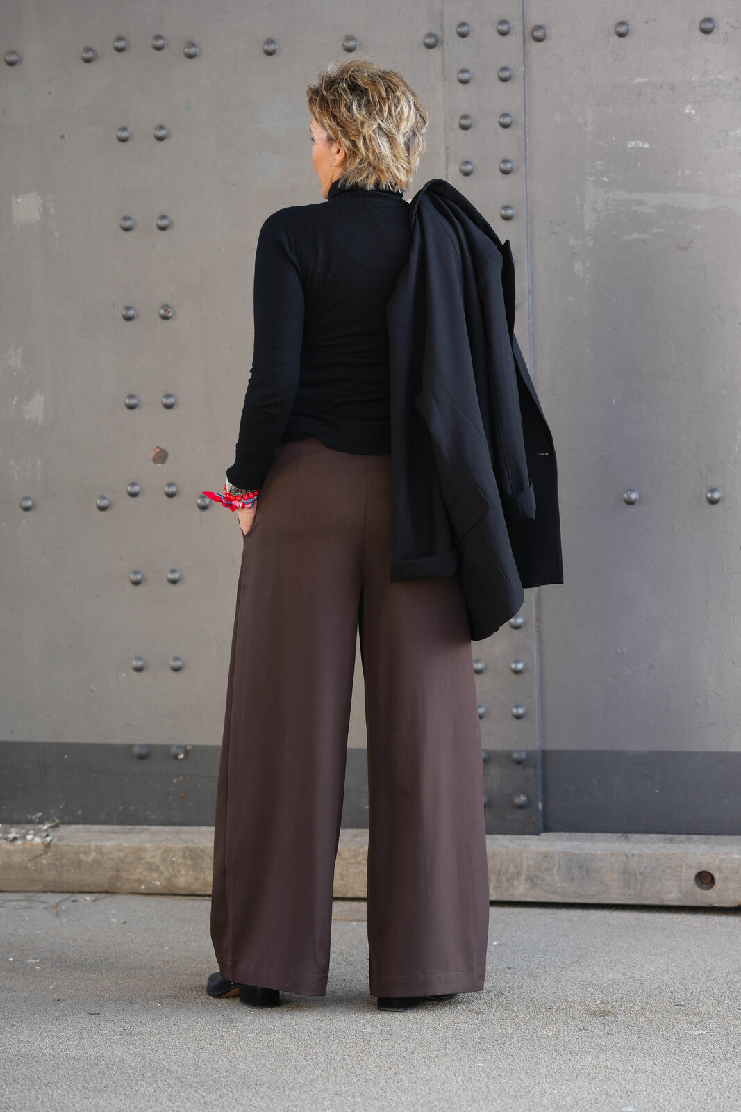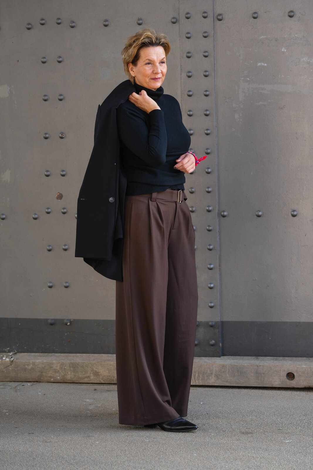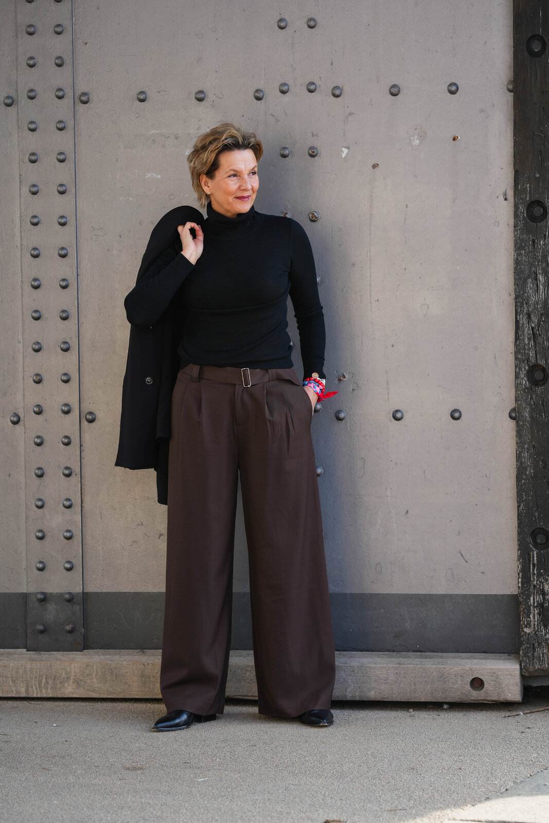 - breiter Bund mit Gürtelschlaufen und Knopf