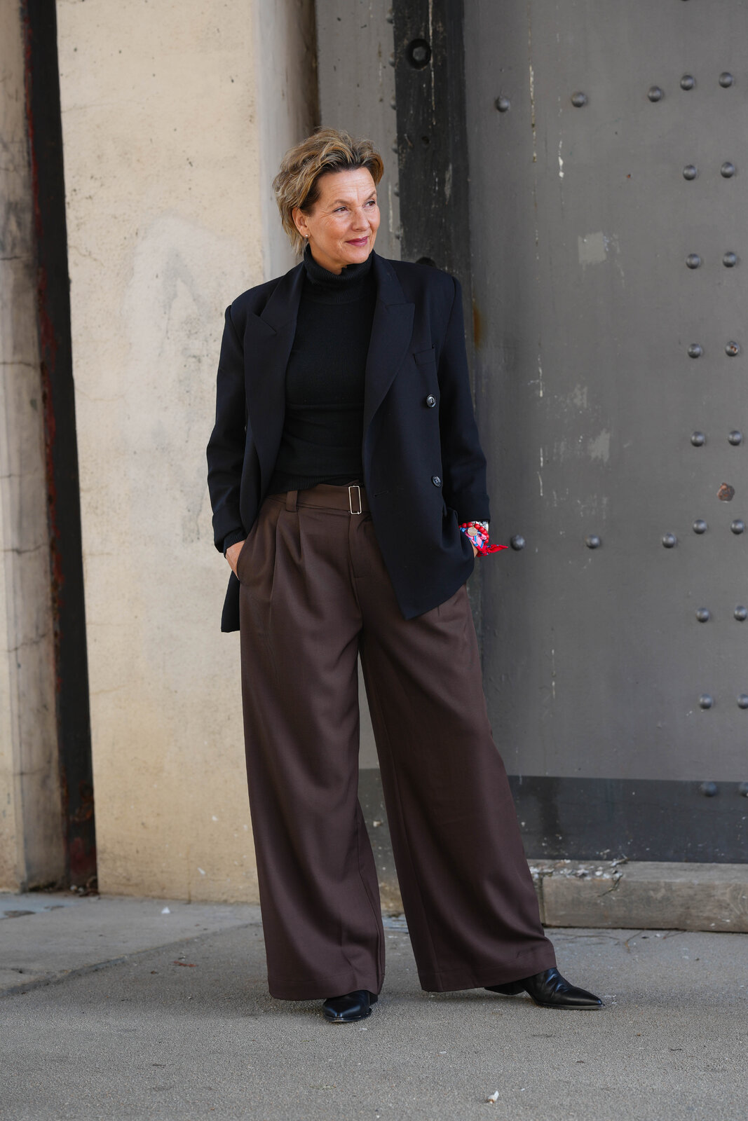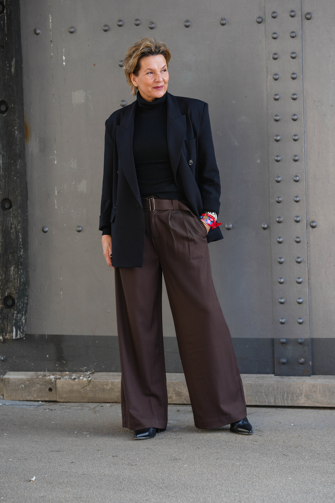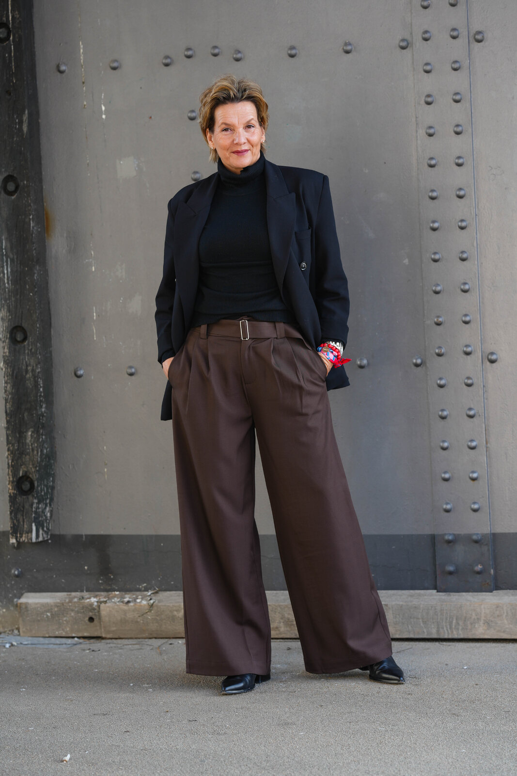 - breiter Bund mit Gürtelschlaufen und Knopf