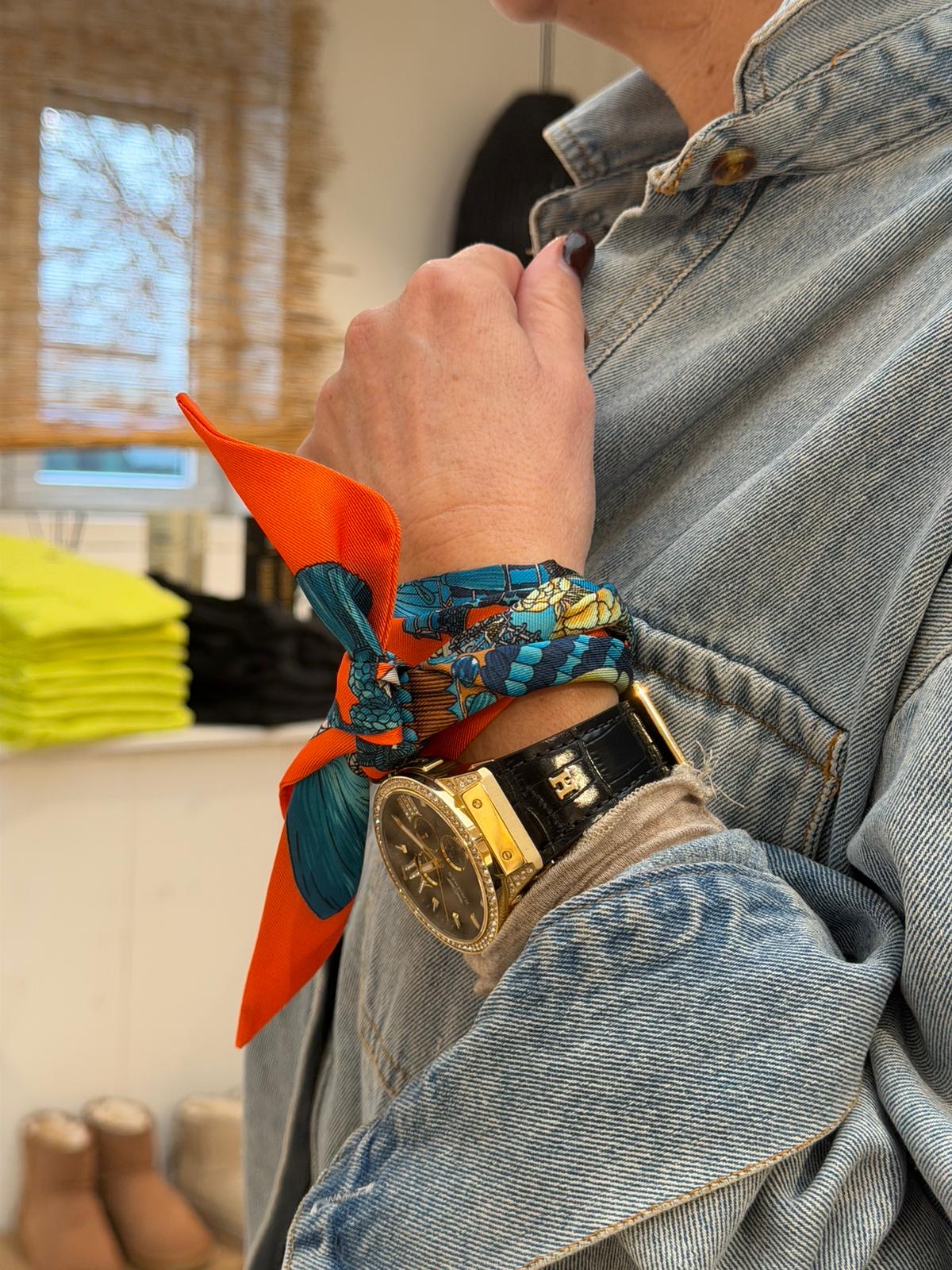 Zart, fließend und angenehm glatt auf der Haut, dieses feine Halstuch ist ein kleines Detail mit großer Wirkung. Die fließende Qualität umschmeichelt sanft und verleiht jedem Outfit eine elegante Leichtigkeit. Dank der verschiedenen Designs lässt sich das Tuch immer wieder neu interpretieren. Klassisch am Hals getragen oder lässig und modern als stilvolles Statement am Handgelenk. Ein Accessoire, das Persönlichkeit zeigt und jedem Look das gewisse Etwas verleiht.