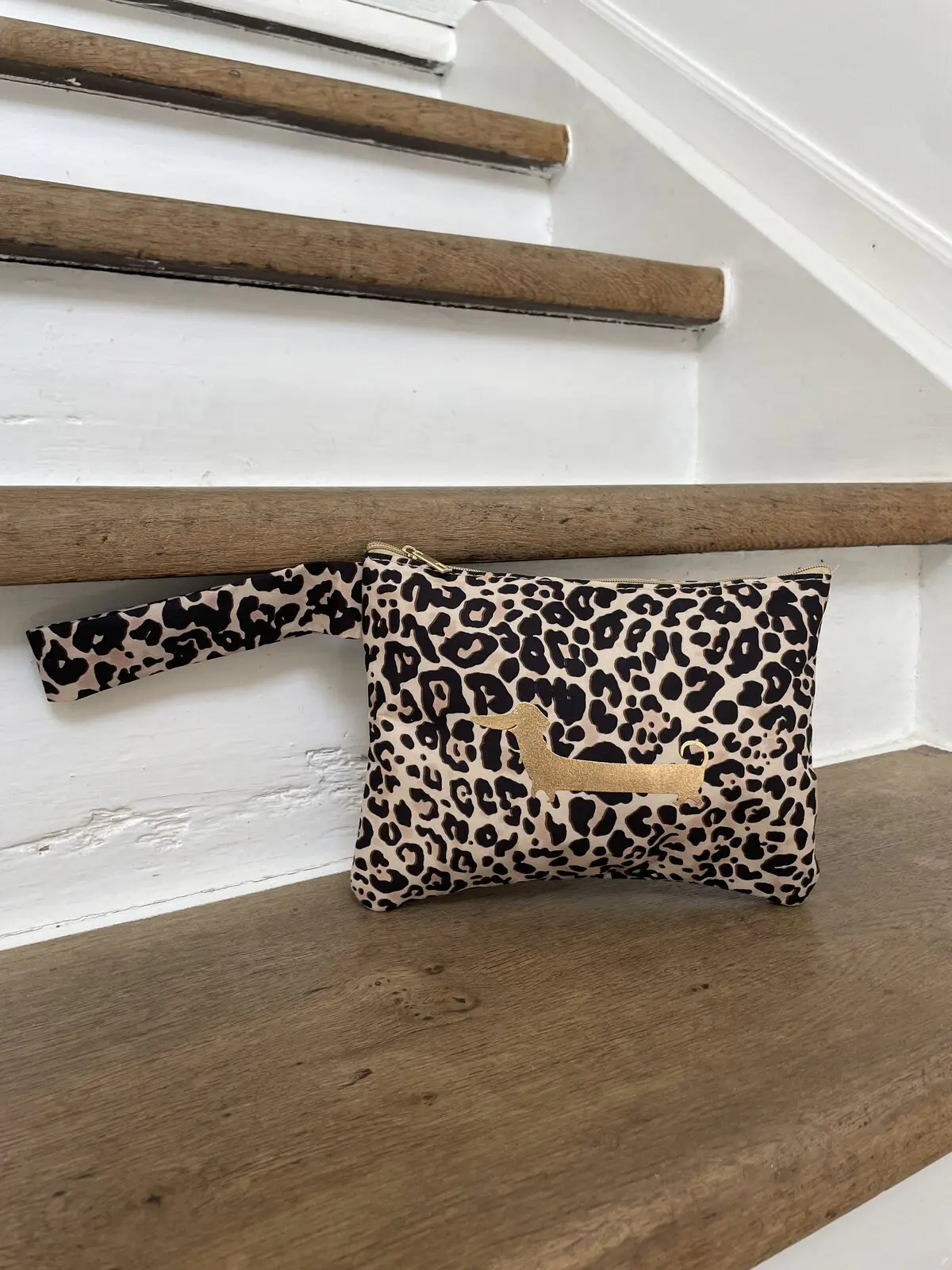 Diese coole kleine Henkeltasche ist ein perfektes It Piece für jede Gelegenheit. Der angesagte Leoprint mit dem goldenen oder pinken Dackel ist ein toller Eyecatcher. Du kannst sie als Kosmetiktasche oder als Bag in Bag Tasche nutzen. In ihr lassen sich alle wichtigen Dinge zu verstauen.