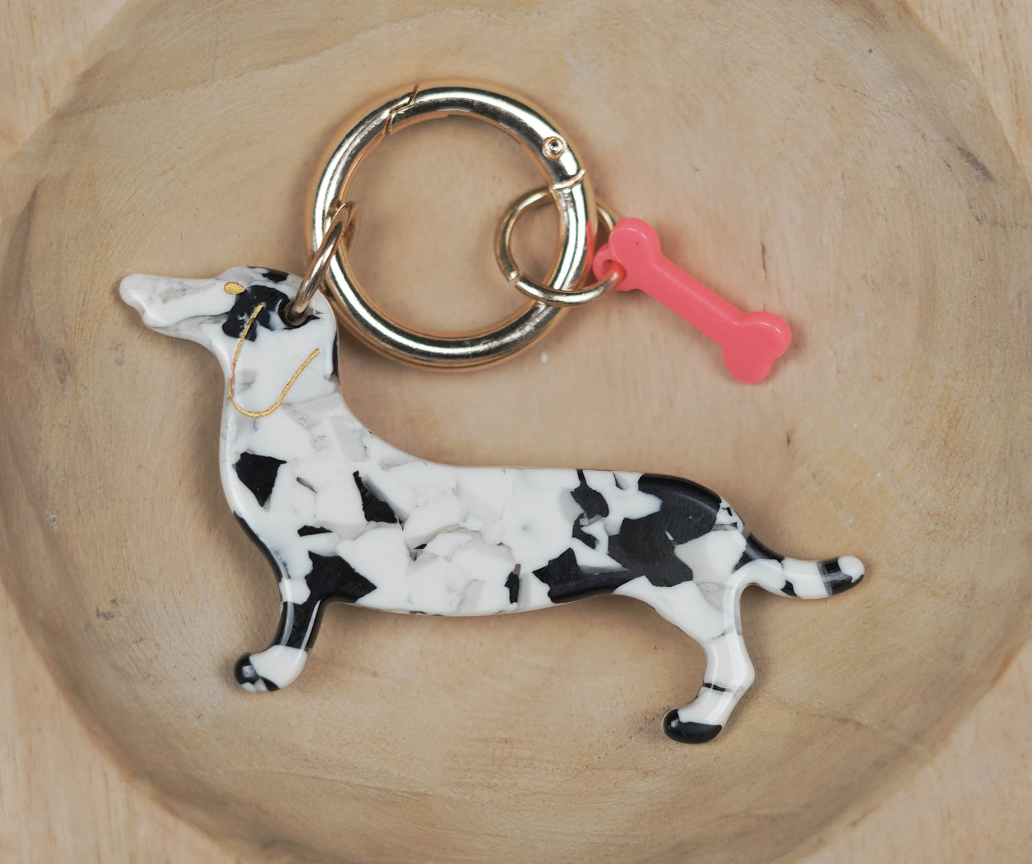 - weiß/schwarzer Dackel Anhänger mit pinkem kleinem Knochen