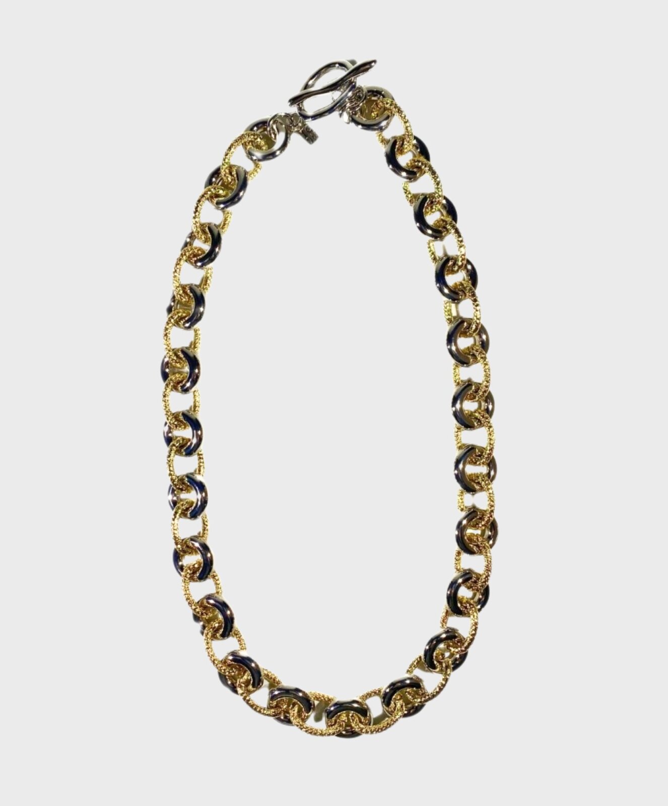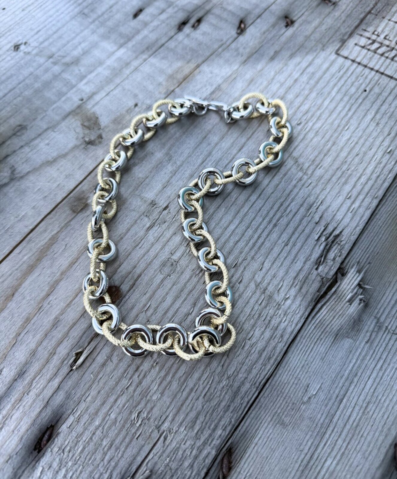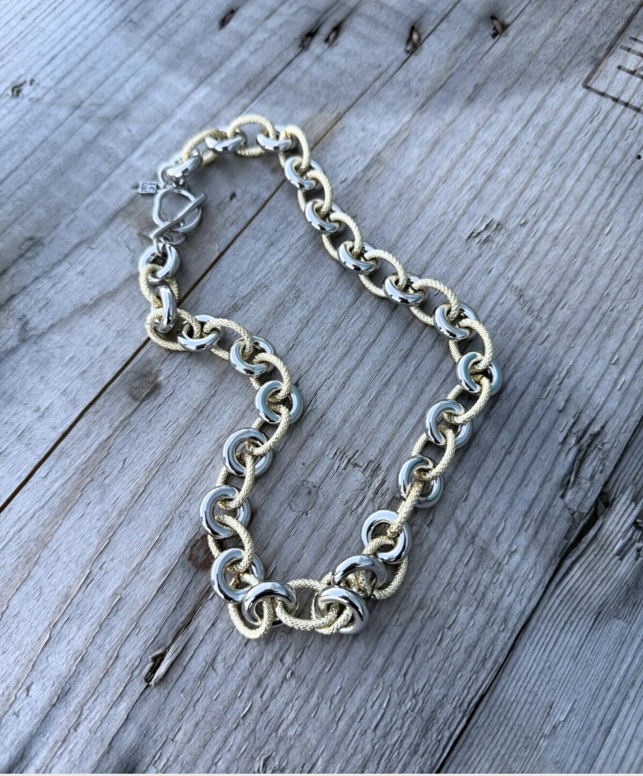 Diese stilvolle Kette von ICON vereint klassische Formen mit einem trendigen Twist. Runde Glieder treffen auf ovale, fein geprägte Elemente und schaffen so ein spannendes, hochwertiges Design. Der angesagte Mix aus Gold und Silber macht das Schmuckstück besonders vielseitig und lässt sich mühelos zu jedem Look kombinieren – ob casual oder elegant. Der markante Knebelverschluss setzt dabei einen zusätzlichen Akzent und sorgt gleichzeitig für komfortables Tragen.
