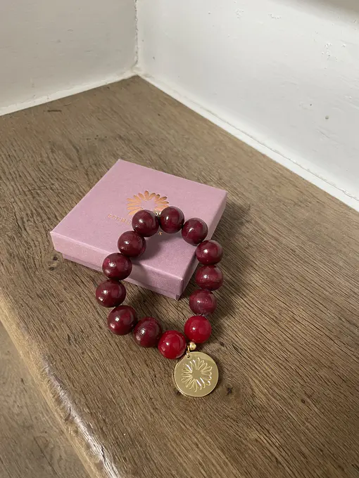- Erdbeerquarz-Anhänger und Logo-Tag aus vergoldetem Messing