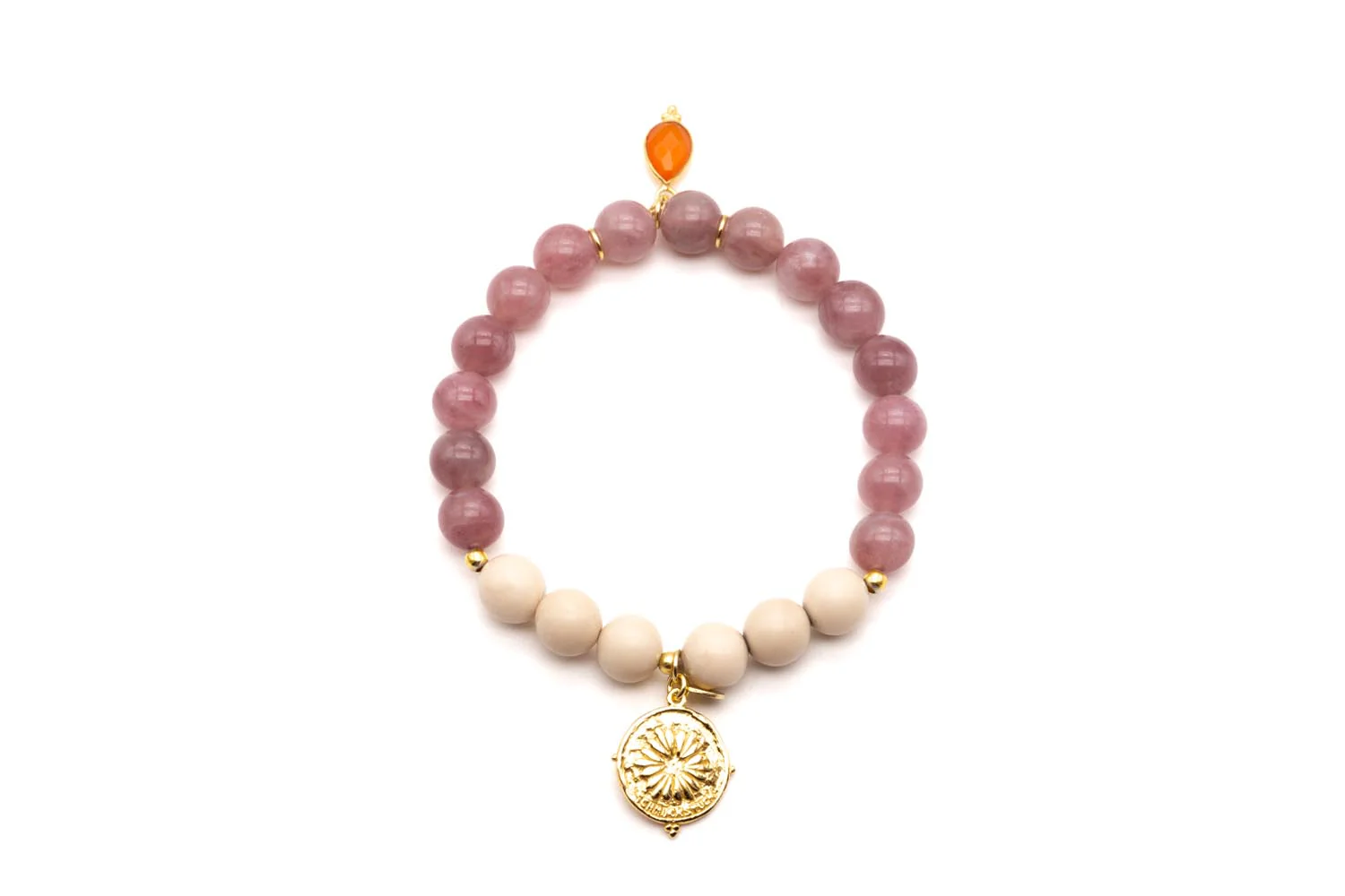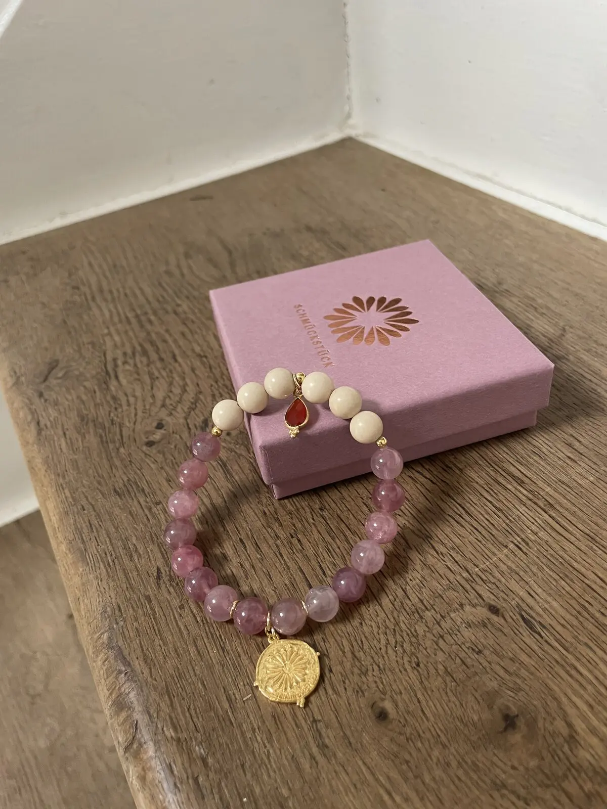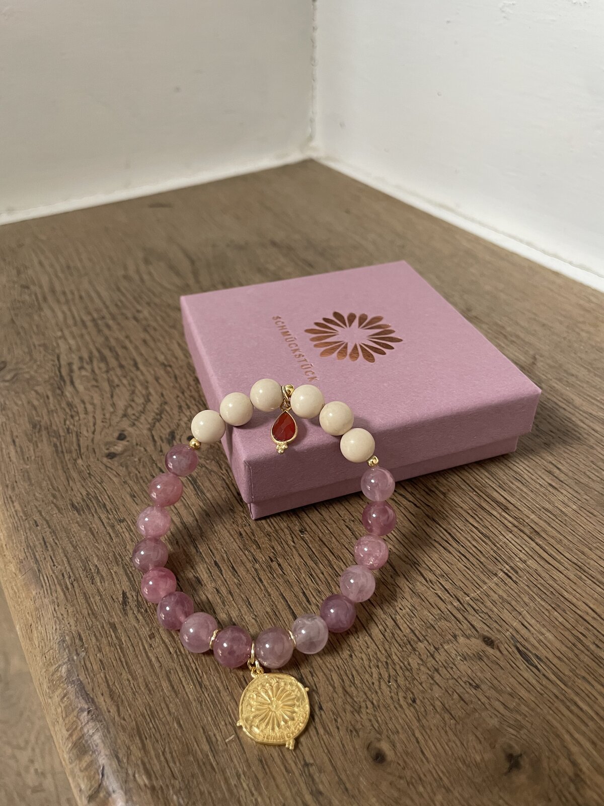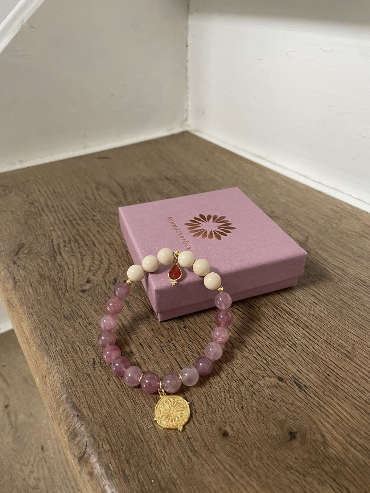 - Perlen (8mm) aus Rosenquarz und Fossil