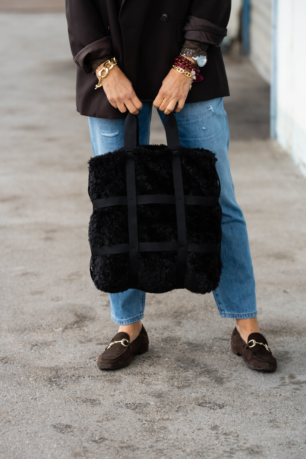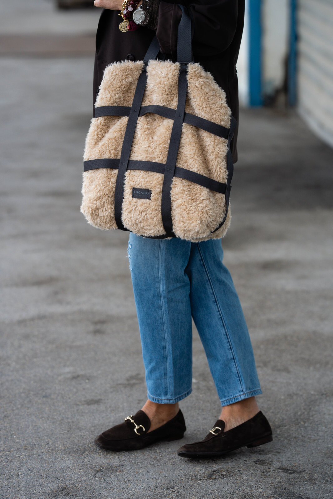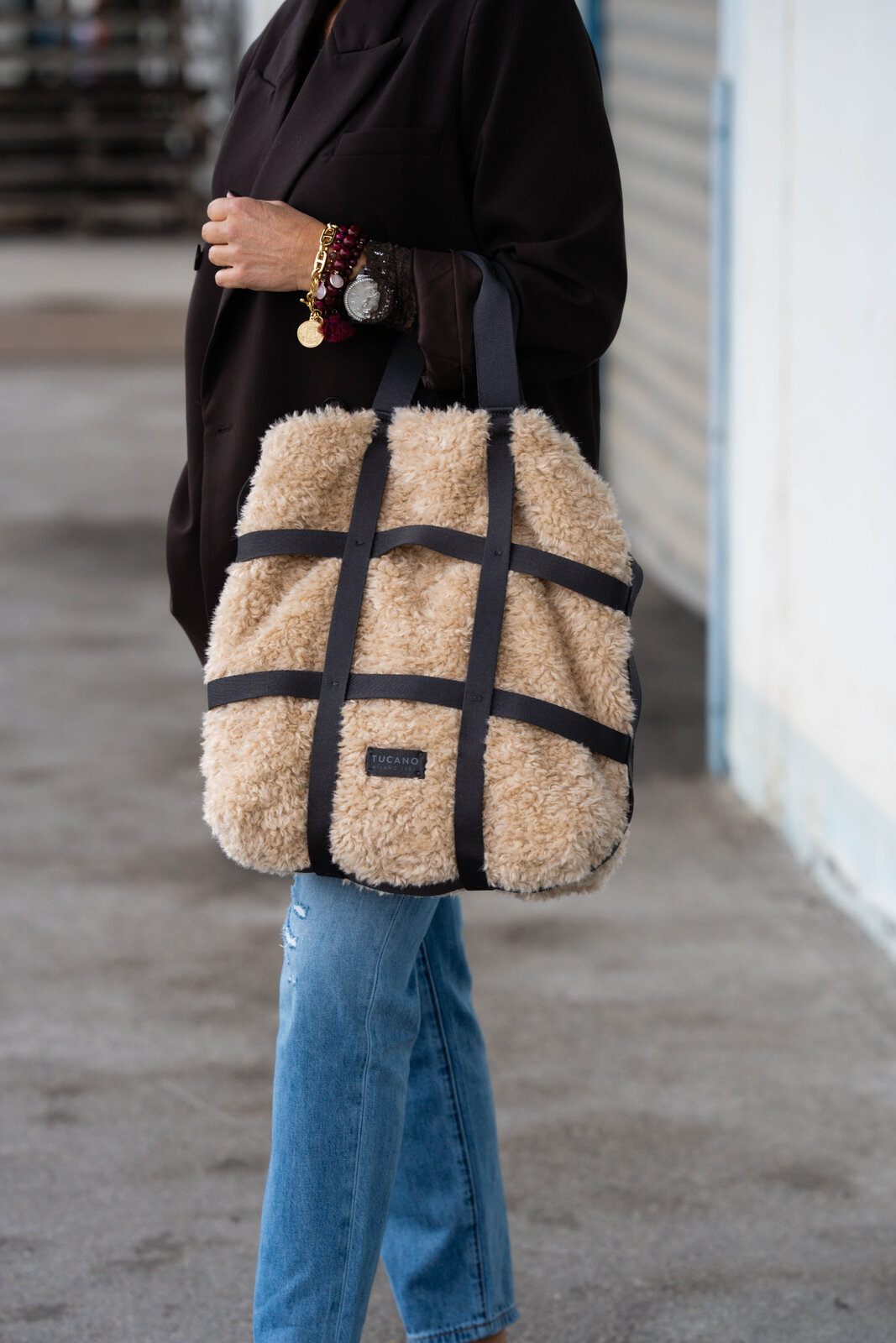 Diese stylische Kunstpelztasche von TUCANO kombiniert weiche Haptik mit raffinierter Detailarbeit und wird damit zum stilvollen Statement-Piece für jeden Anlass. Der flauschige Kunstpelz wird von einem dekorativen Gitter aus Bändern überzogen, das der Tasche eine moderne, strukturierte Optik verleiht.