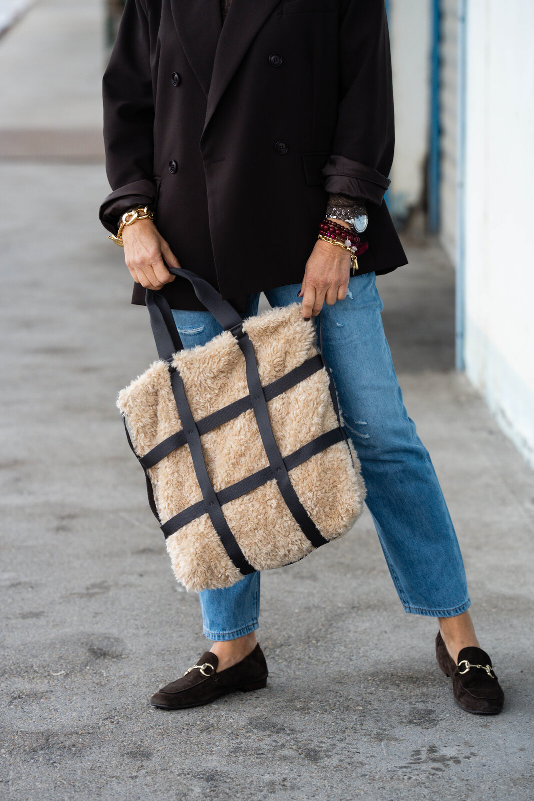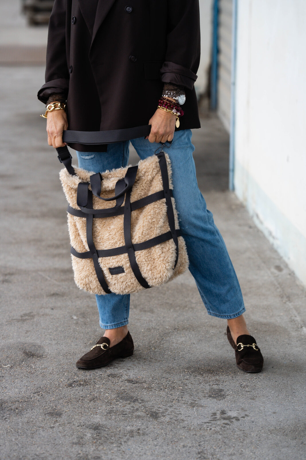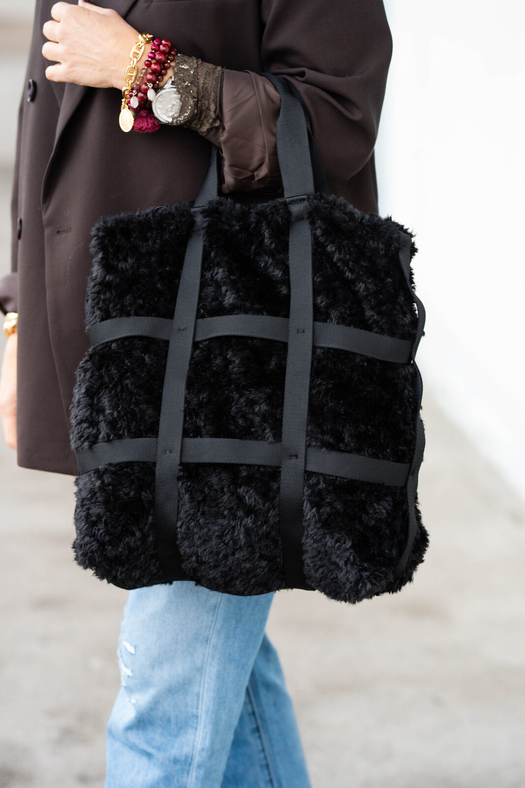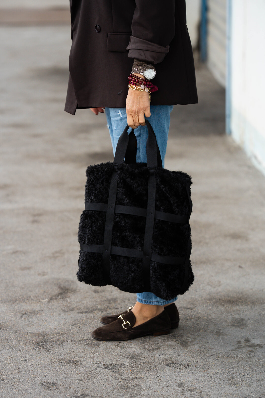 Diese stylische Kunstpelztasche von TUCANO kombiniert weiche Haptik mit raffinierter Detailarbeit und wird damit zum stilvollen Statement-Piece für jeden Anlass. Der flauschige Kunstpelz wird von einem dekorativen Gitter aus Bändern überzogen, das der Tasche eine moderne, strukturierte Optik verleiht.